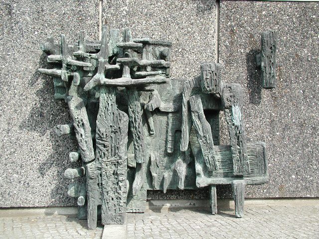 Die erste Station des Kreuzweges von Otto Herbert Hajek. Sie stellt die Szene dar, wie Jesus (mit der überschweren Dornenkrone l.) von dem römischen Statthalter Pontius Pilatus (r.) obwohl unschuldig zum Tode verurteilt wird. Anmaßung der Macht ohne Recht.