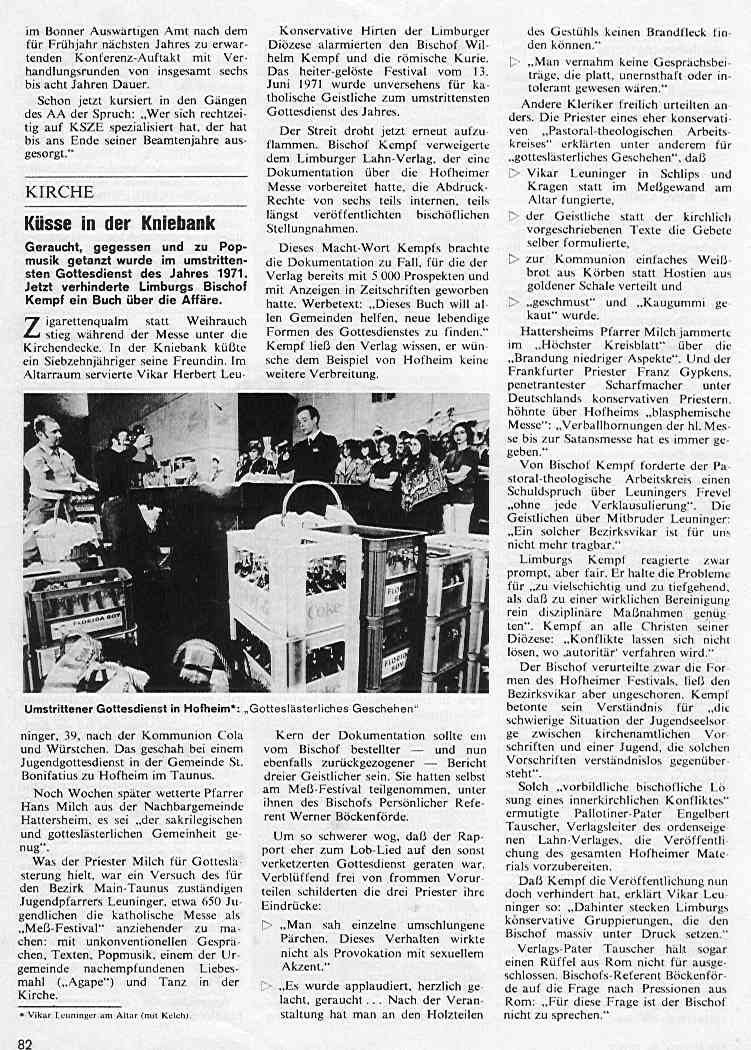 Konservative Hirten der Limburger Diözese alarmierten den Bischof Wilhelm Kempf und die römische Kurie. Das heiter-gelöste Festival vom 13. Juni 1971 wurde unversehens für katholische Geistliche zum umstrittensten Gottesdienst des Jahres.