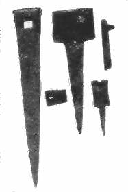 Die Eisenteile am Nagelstock: Links der "Stappe", in der Mitte der Amboss, dazwischen der Hammer. Rechts vom Amboss Nageleisen (oben) und Schrot.