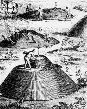 Der alte Stich zeigt die Anlage und den Betrieb eines Holzkohlenmeilers. unten (2): der Aufbau des Meilers; Mitte (5): ausgebrannter Meiler; oben (6): das Abreissen des Meilers.
